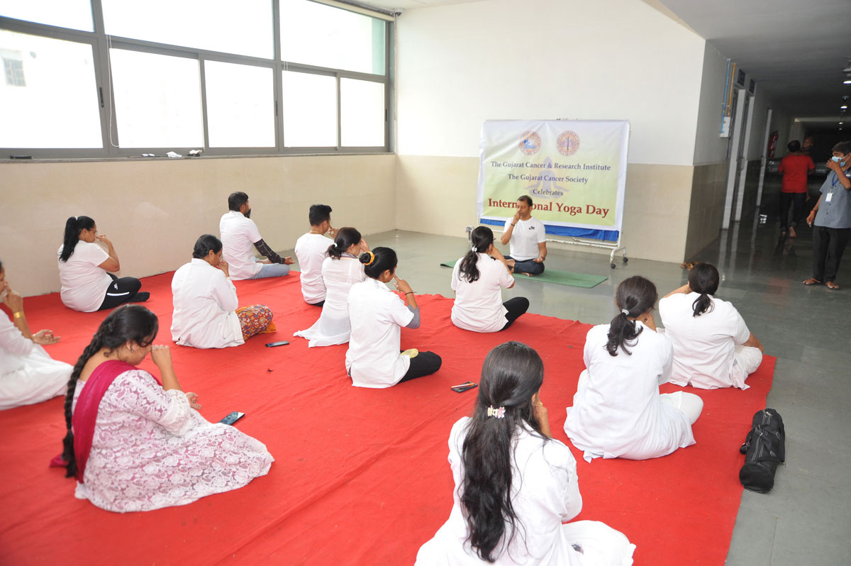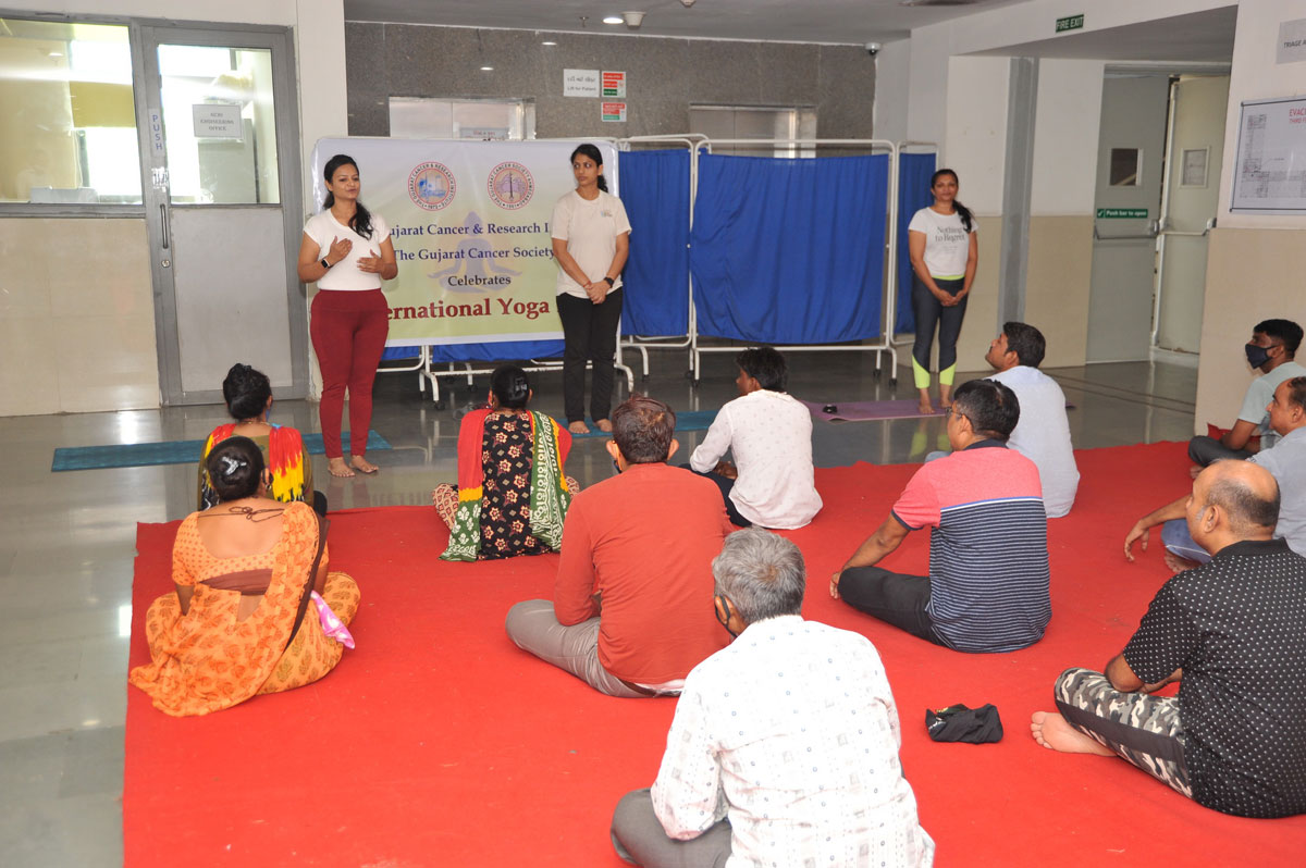 8th International Yoga Day Celebrated on June 21, 2022. GCRI Cancer Patients, Patients Relatives, GCRI Doctors, Paramedical Staff and Admin Staff performed Yoga. Ms Nirja Shukla PhD Scholar, Department of Ashtang Yoga, Lakulish Yoga University, Ahmedabad and her team of six Yoga Teachers conducted Yoga Session on ‘Yoga for Humanity’.